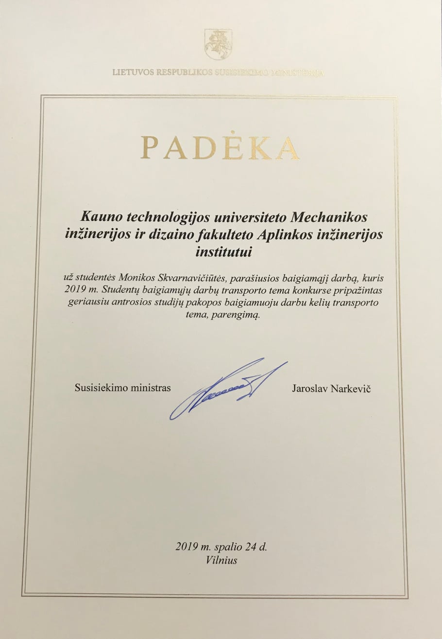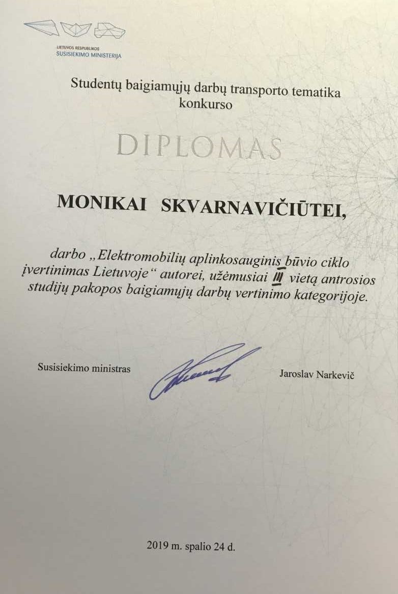 Norime pasidžiaugti APINI magistrantūros studijų programos „Darnus valdymas ir gamyba“ studente Monika Skvarnavičiūte (darbo vadovė Prof. dr. Jolanta Dvarionienė), kurios magistro baigiamasis darbas tema „Elektromobilių aplinkosauginis būvio ciklo įvertinimas Lietuvoje“ studentų baigiamųjų darbų transporto tematika konkurse, organizuotame Lietuvos Respublikos Susisiekimo ministerijos, pripažintas geriausiu antros studijų pakopos baigiamuoju darbu kelių transporto tema!